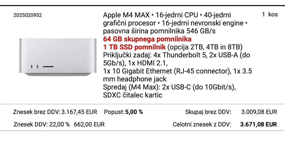 •do 64GB (M4 Max z 32‑core GPU) ali 128GB (M2 Max z 40‑core GPU) enotnega pomnilnika