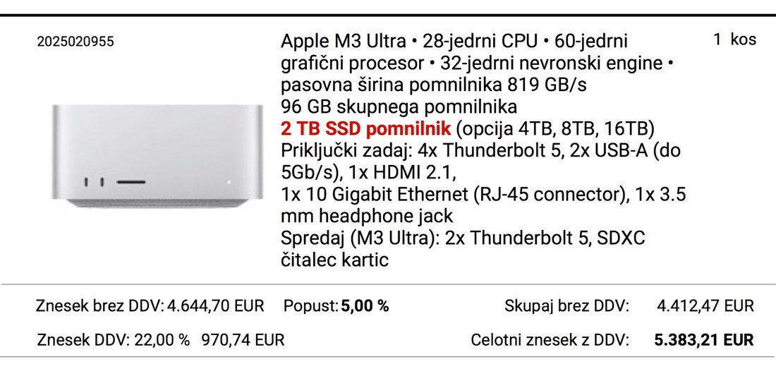 •do 256GB (M3 Ultra z 60‑core GPU) ali 512GB (M3 Ultra z 80‑core GPU) enotnega pomnilnika